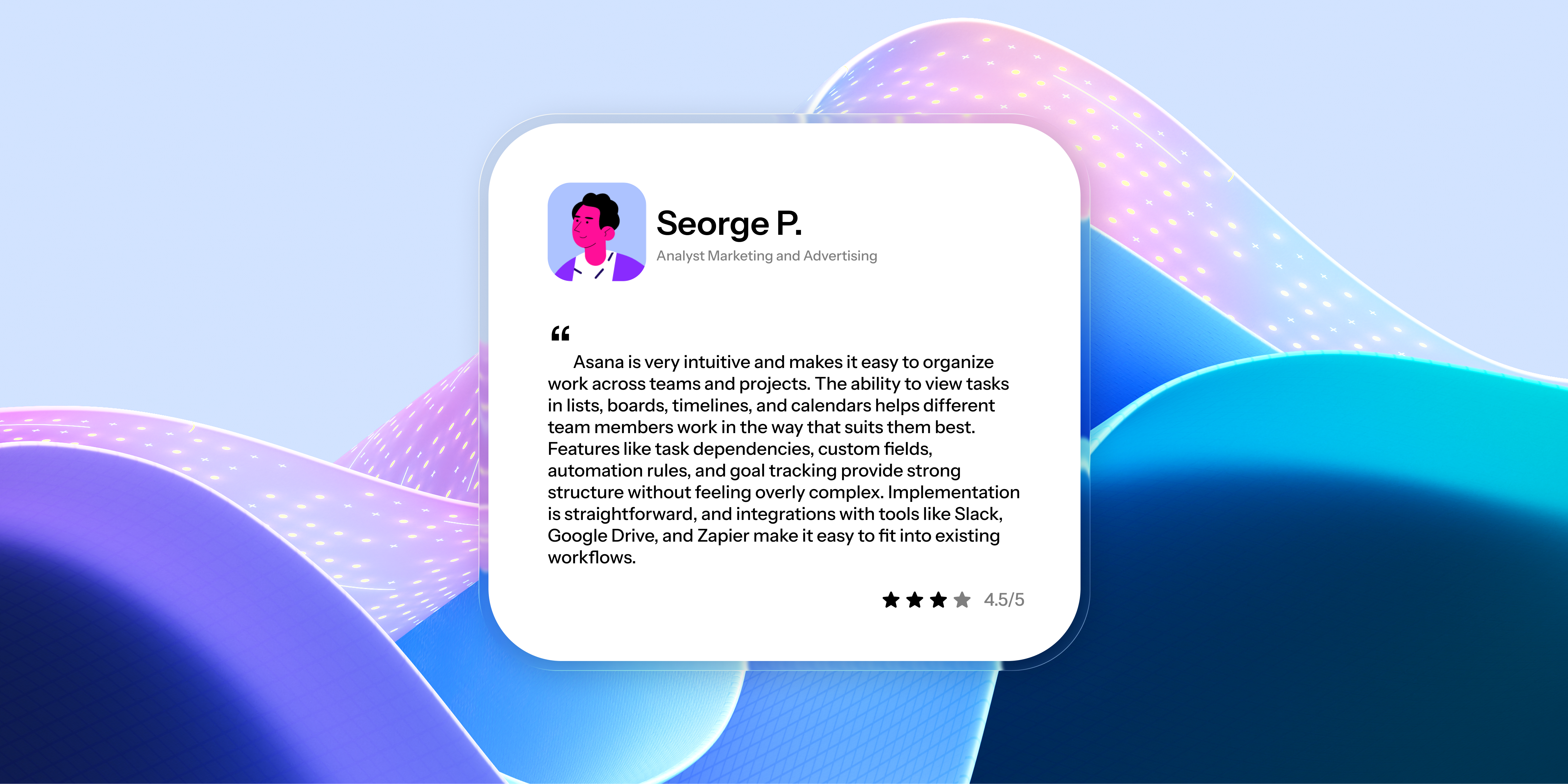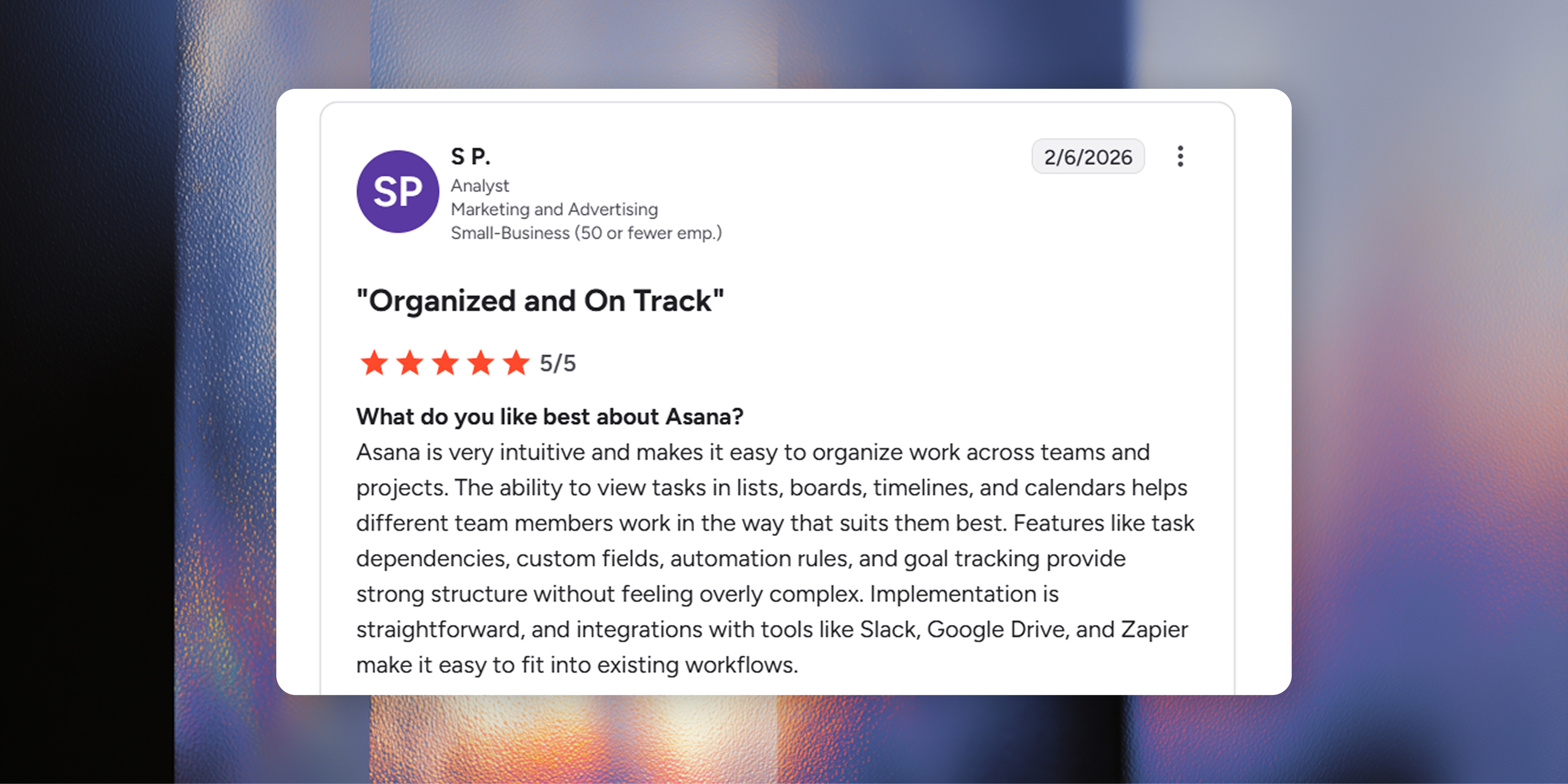 "Asana is very intuitive and makes it easy to organize work across teams and projects. The ability to view tasks in lists, boards, timelines, and calendars helps different team members work in the way that suits them best...."